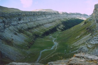 Domina su orografía el macizo de Monte Perdido (3.355 m), con las cimas de las Tres Sorores, desde donde derivan los valles de Ordesa, Pineta, Añisclo y Escuaín. Un paisaje de grandes contrastes: la extrema aridez de las zonas altas, donde el agua de lluvia y deshielo se filtra por grietas y sumideros, contrasta con los verdes valles cubiertos por bosques y prados, donde el agua forma cascadas y atraviesa cañones y barrancos.